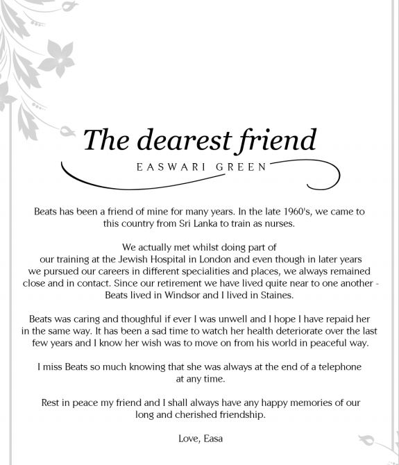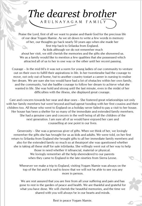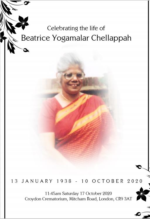 Beatrice Yogamalar Chellappah (Yogam): It is with great sadness the family announces the passing of Beatrice Yogamalar Chellappah (Yogam), after a lengthy illness on 10th October, 2020 in Croydon, United Kingdom.