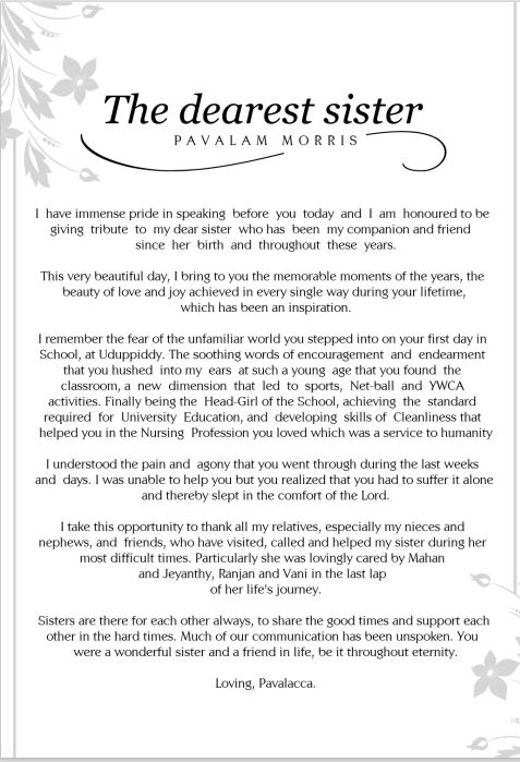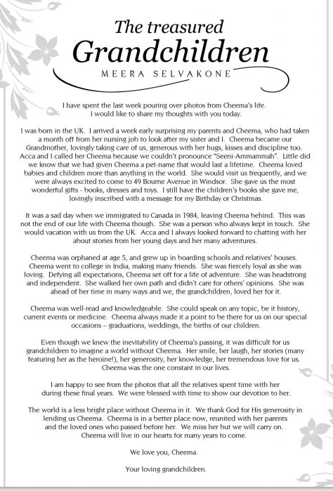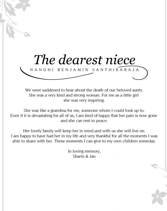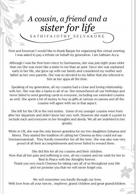 Beloved youngest daughter of late Mudaliyar Stephen Murugesu Chellappah & late Victoria Arulammah of Karaveddy East, Karaveddy, Sri Lanka, ever- loving sister and sister-in-law of late Winslow Vethanayagam & late Pushparani, late Geevamalar & late Murugesu Mathibalasingham, late Gnanamalar & late Jeyarajah Chelliah, late Samuel Arulnayagam & Kamala (UK), Pavalamalar & Maurice Nalliah(Canada), cherished Seeni-ammah of Sathiam, Vimi, Chandran, Ranjit, Shiranjani, Lalit, Nalini, late Ajit, Vijit, Sujit, Daljit, Premini and Nilanthi, affectionate Yogam mamie of Indran(JP), Chandrika, Vasanthika, Kamalendran and late Vijayendran, loving grandmother and great-grandmother, who was fondly called “Cheema” by her dear ones.