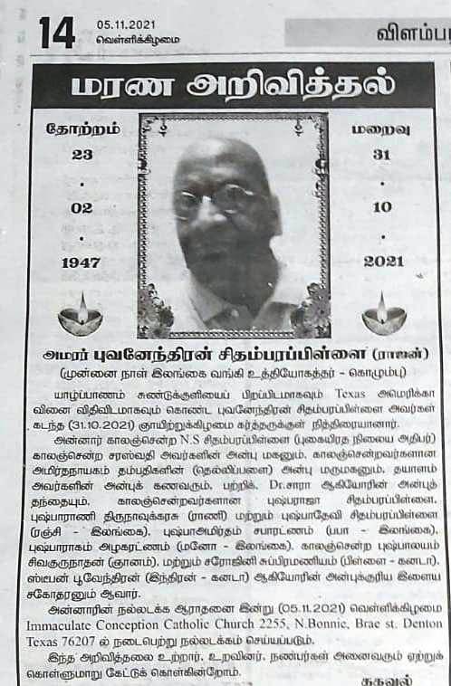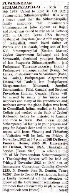 Puvanendran Sithamparapillai : It is with a heavy heart that the Sithamparapillai family announce that Puvanendran Sithamparapillai (also known as Rajan and Puvi) was called to rest on 31 October 2021 in Denton, Texas, USA.