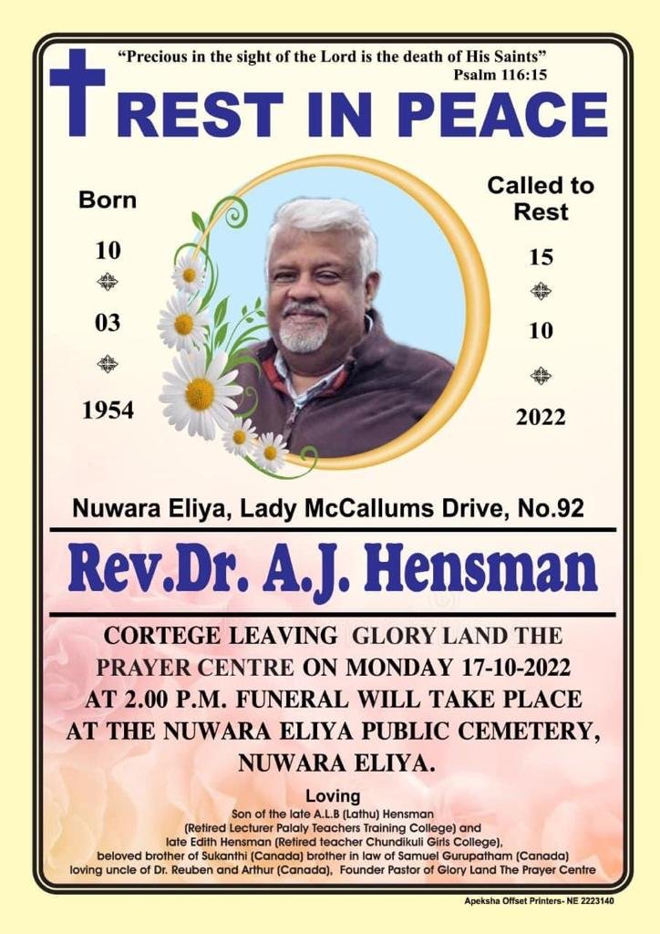 Obituaries Rev.Dr. AJ. Hensman (1954 -2022) October 17, 2022October 17, 2022 Final VoyageLeave a comment Share this: Click to share on Facebook (Opens in new window) Facebook Click to email a link to a friend (Opens in new window) Email Click to print (Opens in new window) Print Like Loading... Related