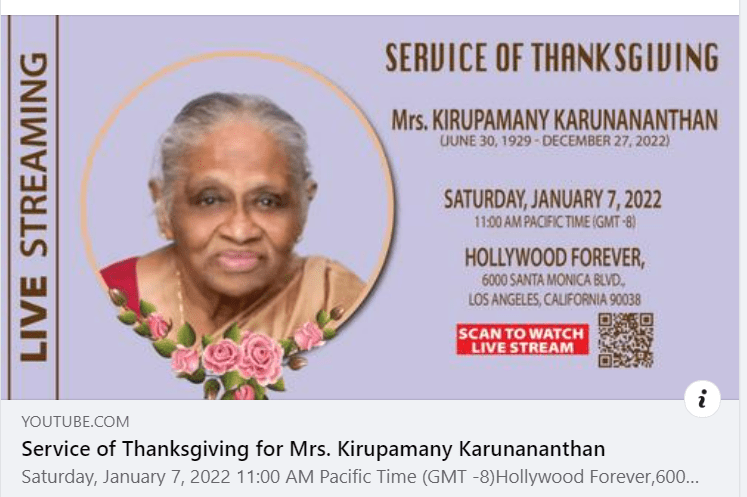 Please scan the QR code on the image below to watch the live streaming or click on : Service of Thanksgiving for Mrs. Kirupamany Karunananthan