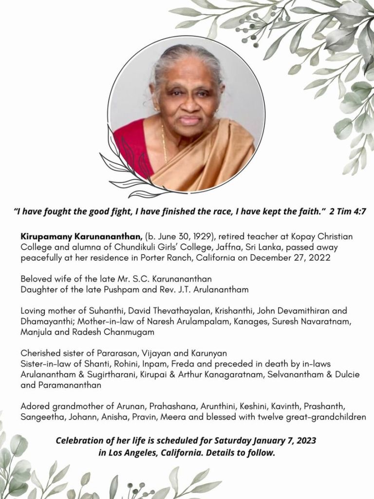 உங்கள் துயர் பகிர்வுகளையும், அனுதாபச் செய்திகளையும் ஒரே இடத்தில் குடும்பத்தார் பார்வையிடுவதற்காக இவ் தளத்தின் பின்னோட்டத்தில் பதிவிடலாம். எக்காரணம் கொண்டும் உங்கள் மின்னஞ்சல் தகவல் இவ் தளத்தில் பதியப்படவோ பகிரப்படவோ மாட்டாது என பணிவுடன் தெரிவித்துக் கொள்கிறோம்.