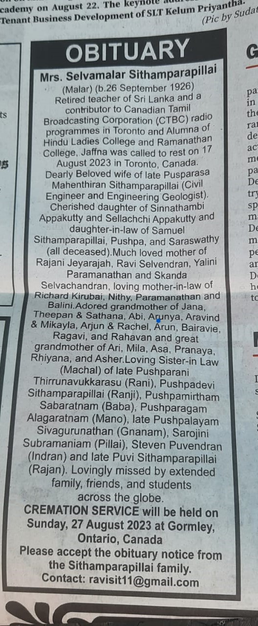 Please accept the obituary notice from the Sithamparapillai family.