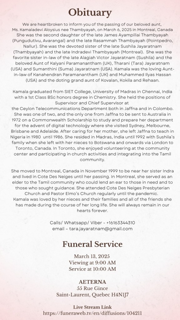 உங்கள் துயர் பகிர்வுகளையும், அனுதாபச் செய்திகளையும் ஒரே இடத்தில் குடும்பத்தார் பார்வையிடுவதற்காக இவ் தளத்தின் பின்னோட்டத்தில் பதிவிடலாம். எக்காரணம் கொண்டும் உங்கள் மின்னஞ்சல் தகவல் இவ் தளத்தில் பதியப்படவோ பகிரப்படவோ மாட்டாது என பணிவுடன் தெரிவித்துக் கொள்கிறோம்.
