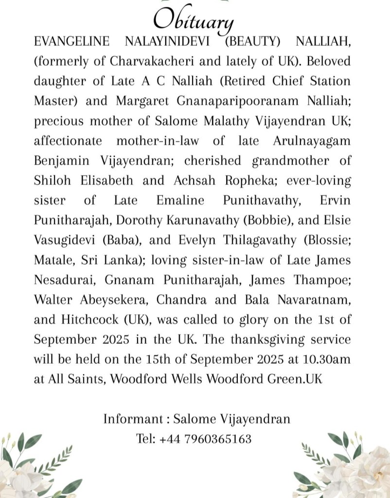 உங்கள் துயர் பகிர்வுகளையும், அனுதாபச் செய்திகளையும் ஒரே இடத்தில் குடும்பத்தார் பார்வையிடுவதற்காக இவ் தளத்தின் பின்னோட்டத்தில் பதிவிடலாம். எக்காரணம் கொண்டும் உங்கள் மின்னஞ்சல் தகவல் இவ் தளத்தில் பதியப்படவோ பகிரப்படவோ மாட்டாது என பணிவுடன் தெரிவித்துக் கொள்கிறோம்.