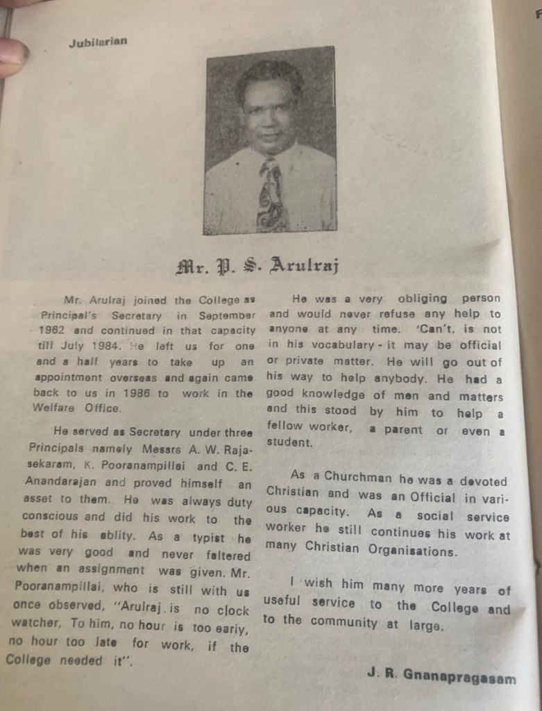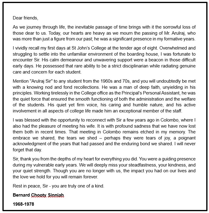 St Johns College Tutorial staff and students remember the late Mr. Arulraj as a gentle dedicated soul. A loyal secretary for many Principals for nearly a quarter of a century and was well respected by the wider St. Johns College community. May his soul rest in peace.