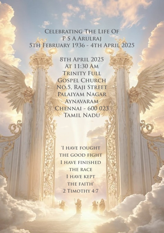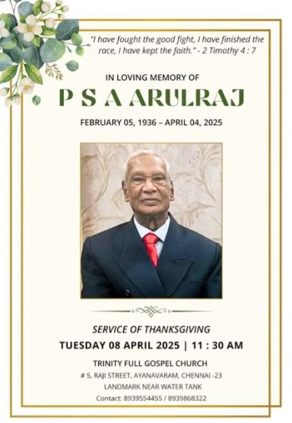 P.S.A Arulraj (1936 – 2025) : Formally of Chundikuli, Jaffna and retired administrative staff of St. Johns College, called to rest on 4 April 2025 in Chennai, India.