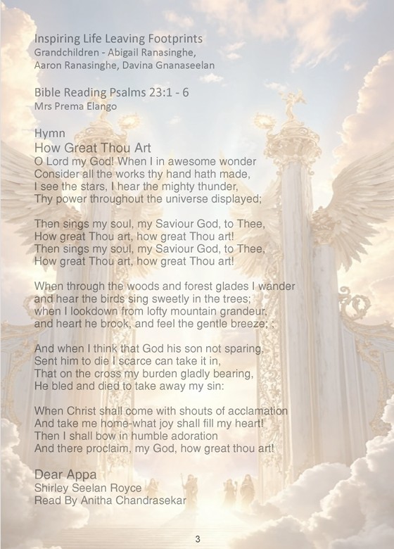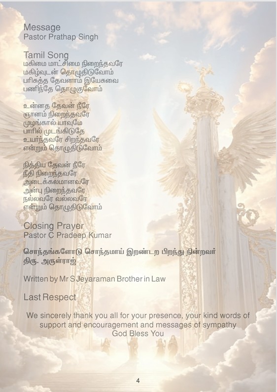 Beloved husband of the late Anna Arulraj and loving father of Shirley Shanthini (Sri Lanka), Gnanaseelan (India), and Royce Angelo (UK). He is also remembered by his son-in-law Dr. Nalin Ranasinghe, daughter-in-law Manju Gnanaseelan and his cherished grandchildren Abigail Ranasinghe, Aaron Ranasinghe and Davina Gnanaseelan.